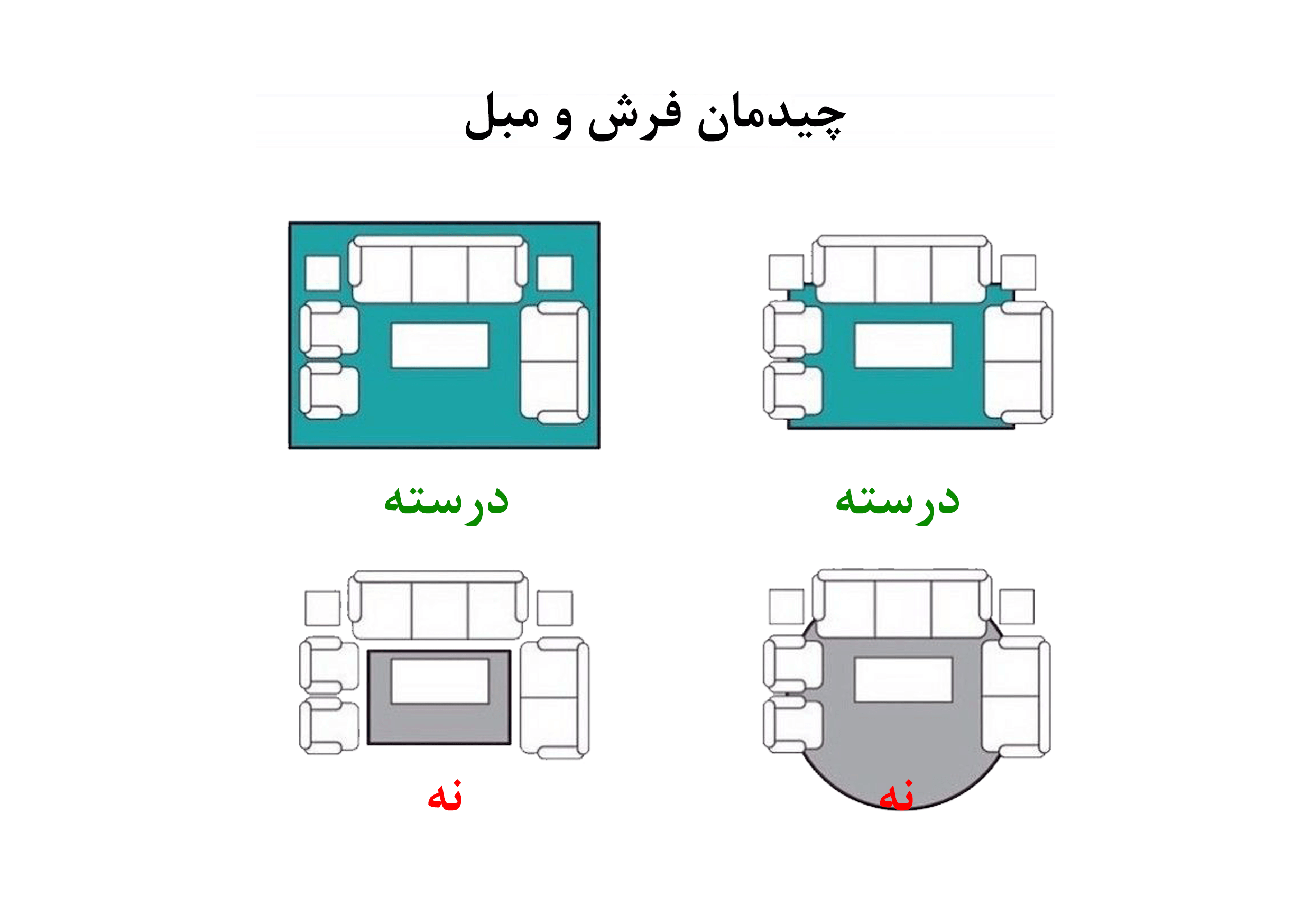 چطوریه؟ فرش فقط در مرکز فضا (زیر میز جلو مبلی) قرار میگیره و مبلها کاملاً دور اون چیده میشن.